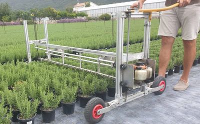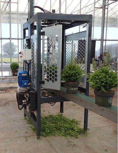 The Dutch Tree Machinery Pruning Line is designed for pruning potted plants, making it ideal for uniformly pruning plants in a greenhouse or nursery. The pruning line is modular, making it widely applicable.